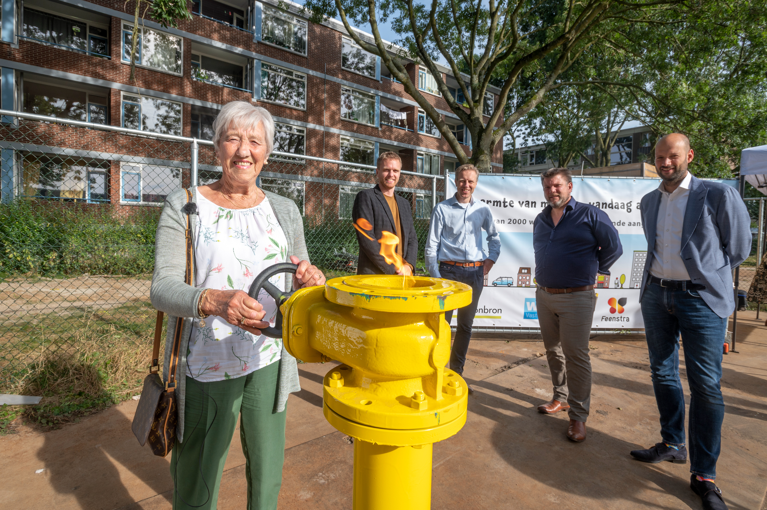 Op de foto: mevrouw Dorsman, de oudste huurder van de Wilbertoord draait symbolisch de gaskraan dicht. Achter haar, v.l.n.r.: Peter Kleinheerenbrink (Commercieel Project Manager Vattenfall), Martin Roders (programmamanager Duurzaamheid Woonbron), Frank Spel (projectleider Willems VGO) en Wilbert Burger (regiomanager Feenstra)