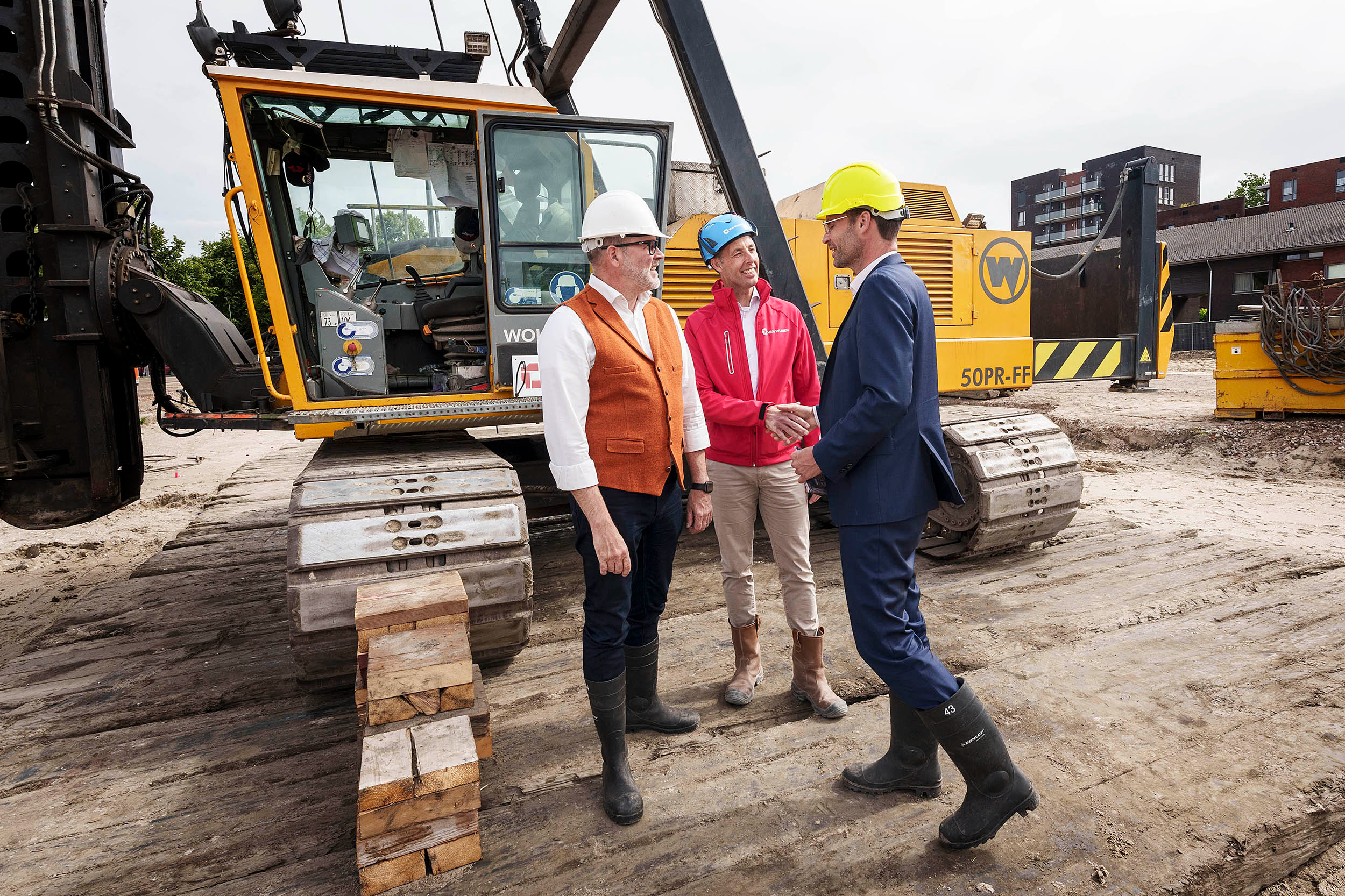Wethouder Peter Heijkoop feliciteert Martin de Jong (vestigingsdirecteur Van Wijnen Dordrecht) en Tomas Schütz (manager Vastgoed & Realisatie Woonbron) met de start bouw van 143 nieuwe woning in het Witte Dorp. (Fotograaf: Marc Blommaert)