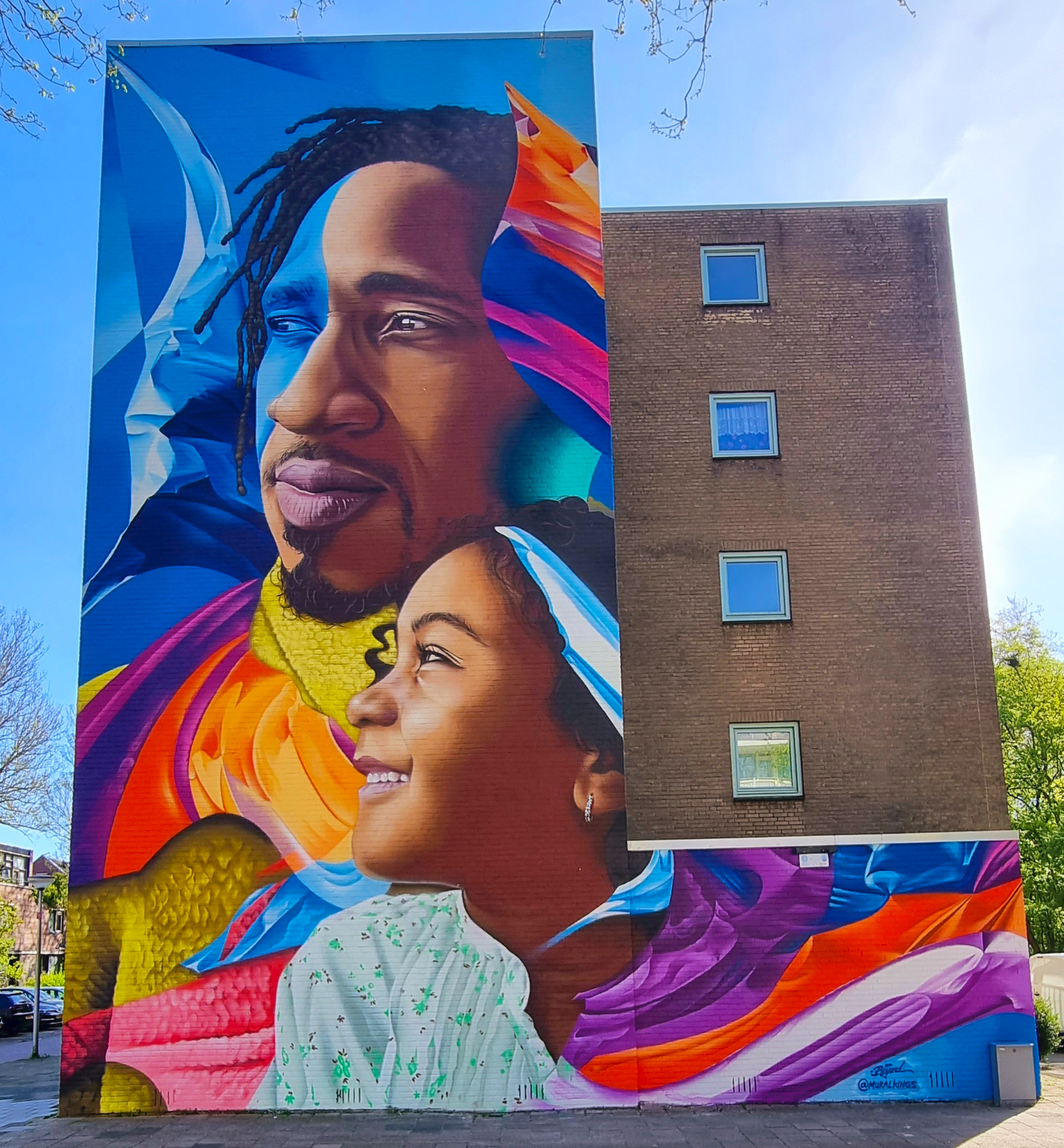 Er is hard gewerkt om de Delftse Buitenhof te verrijken met een prachtige nieuwe muurschildering, getiteld Mirá Mi. Mirá Mi, vertaald als zie mij, is de tweede muurschildering van het project NOBIS Community Art, deze keer ontworpen door internationaal gerenommeerd artiest BEYOND van Mural Kings. "Te zien is de Rotterdamse performer en maker Remses Rafaela met zijn dochter. Hij heeft een blik vol zelfvertrouwen, hij is sterk, hij is er voor zijn dochter. Maar zijn gedachten zijn ook bij zijn zoon, die hij niet mag zien opgroeien," legt de kunstenaar uit. Mirá Mi verbeeldt daarmee een bijzonder verhaal over vaderschap.