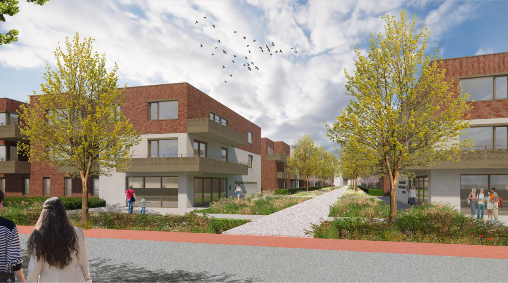 De bovenstaande impressie betreft het voorgevelaanzicht van de vrije sector woningen aan de Marianne straat