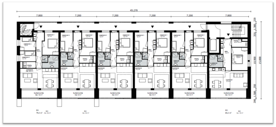Er komen 32 driekamerappartementen en 6 tweekamerappartementen. De appartementen op de etages hebben een balkon over de breedte van de woonkamer en zijn gericht op het zuiden, met uitzicht op het park. De woningen op de begane grond krijgen een tuin. Elke woning heeft een inpandige berging en een individuele fietsenberging op de begane grond.