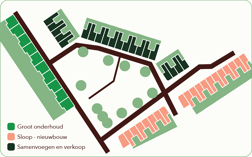 De woningen in deze buurt verschillen onderling van indeling en technische staat. Daarom hebben we per type woning gekeken welke aanpak het beste aansluit bij de mogelijkheden én bij de toekomst van de buurt. Hieronder lees je wat het plan voor de buurt is. De verschillende werkzaamheden worden gefaseerd uitgevoerd. Zo beperken we de overlast en zorgen we ervoor dat een groot deel van de bewoners in de buurt kan blijven wonen.