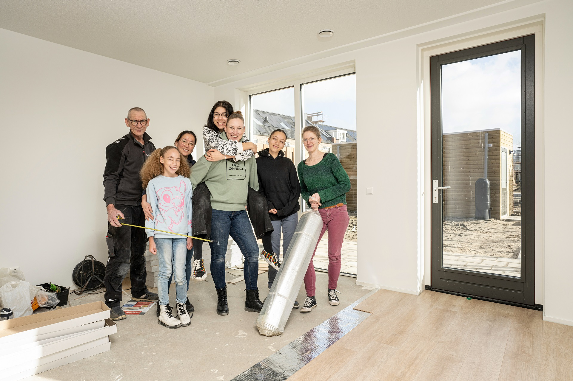 "Dit is echt een lot uit de loterij!" jubelt Tamara als ze de woning laat zien. Ze zijn al vroeg begonnen met het leggen van laminaat en ook opa is ingeschakeld. Tamara kan wel even pauze nemen. "Deze woning kwam niet alleen op het juiste moment. Het is ook nog eens een nieuwbouwhuis dat we helemaal naar onze zin kunnen inrichten, met voldoende ruimte én een tuin. Ook de locatie is perfect. De school waar de jongste naartoe gaat, ligt achter dit huizenblok. Dus het eerste wat ze riep was: 'oh, dan kan ik uitslapen!'"